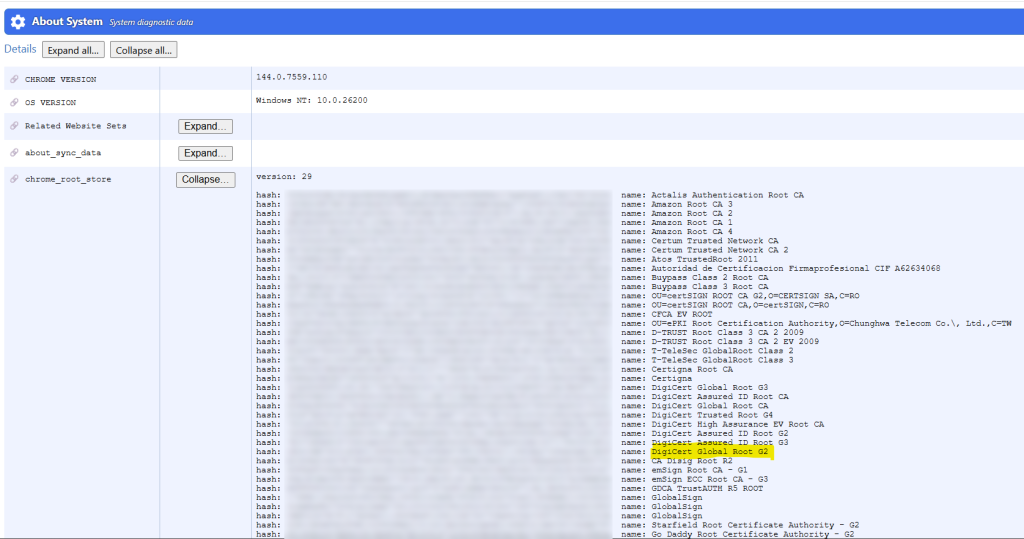 - Or access directly your Chrome Root Store through your Chrome System page by navigating to : chrome://system. Click « Expand… » button on the chrome_root_store line :