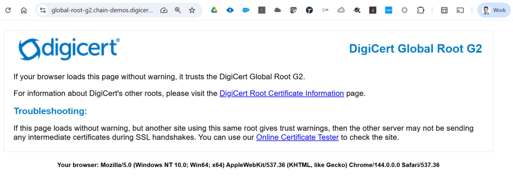 - Navigate to this verification URL : https://global-root-g2.chain-demos.digicert.com/ (waiting for the following page to load, if your browser trusts the Digicert Global Root G2 certificate)